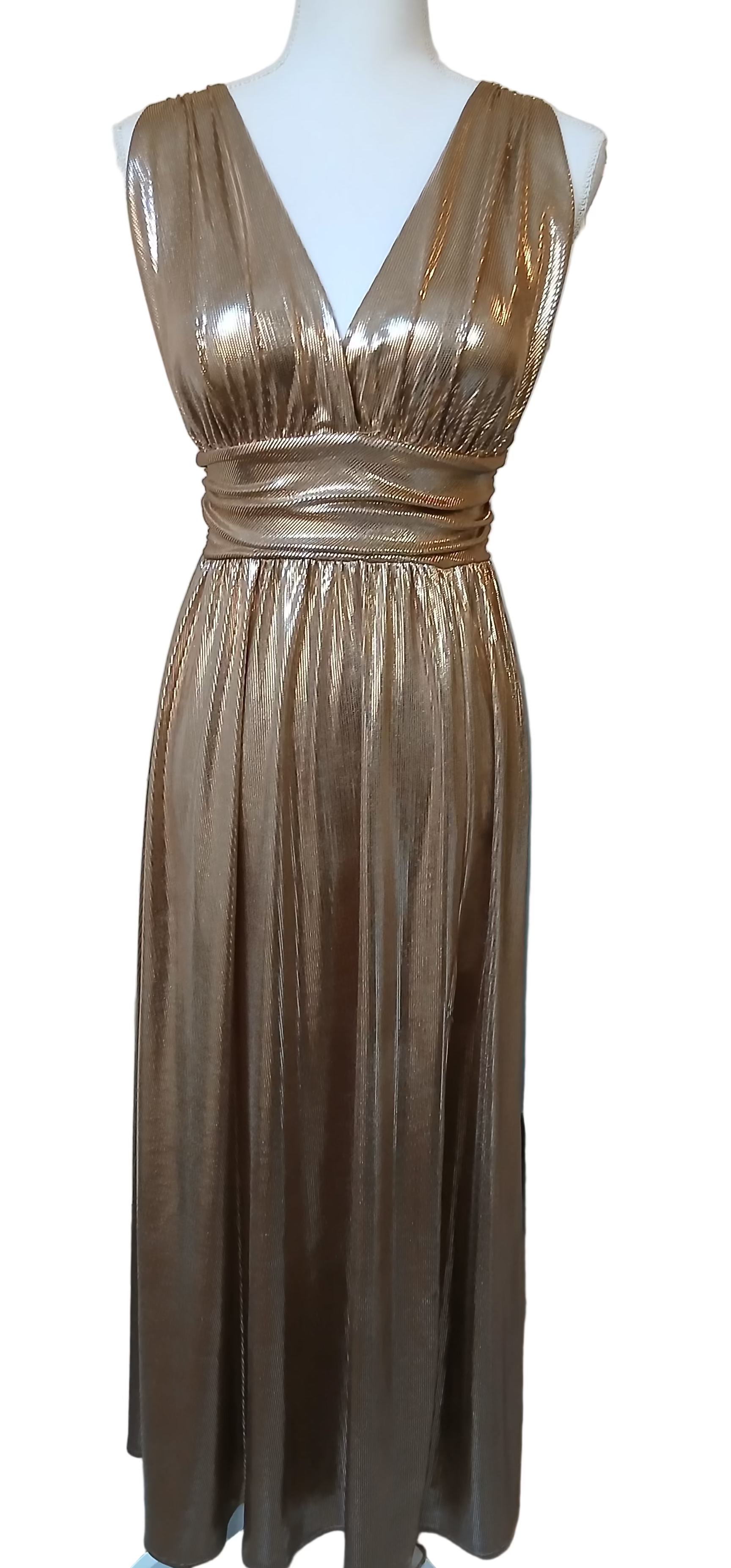 Robe de soirée longue dorée fendue en tissu brillant – Élégante et glamour