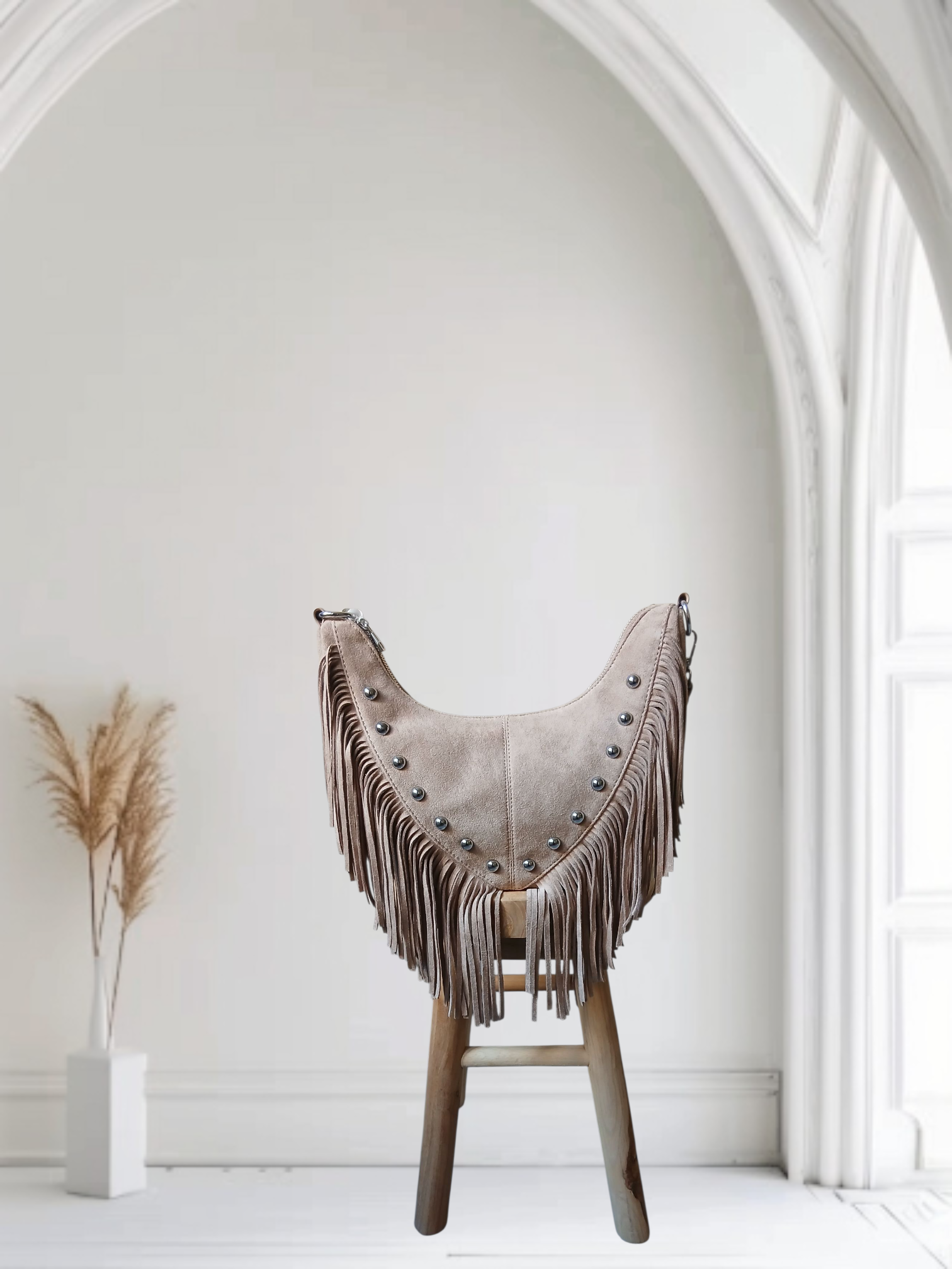 Découvrez notre sac à main à franges beige en suédine, l’accessoire parfait pour sublimer vos tenues du quotidien. Conçu dans une suédine douce et élégante, il offre un toucher velours ultra féminin. Ses petits clous délicats ajoutent une touche tendance et moderne, tout en restant subtils et raffinés.